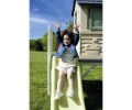 Equipada con: 1 puerta baja, 2 ventanas con contraventanas correderas, 1 ventana de ojo de buey, 1 escalera y 1 tobogán de 1,50 m.